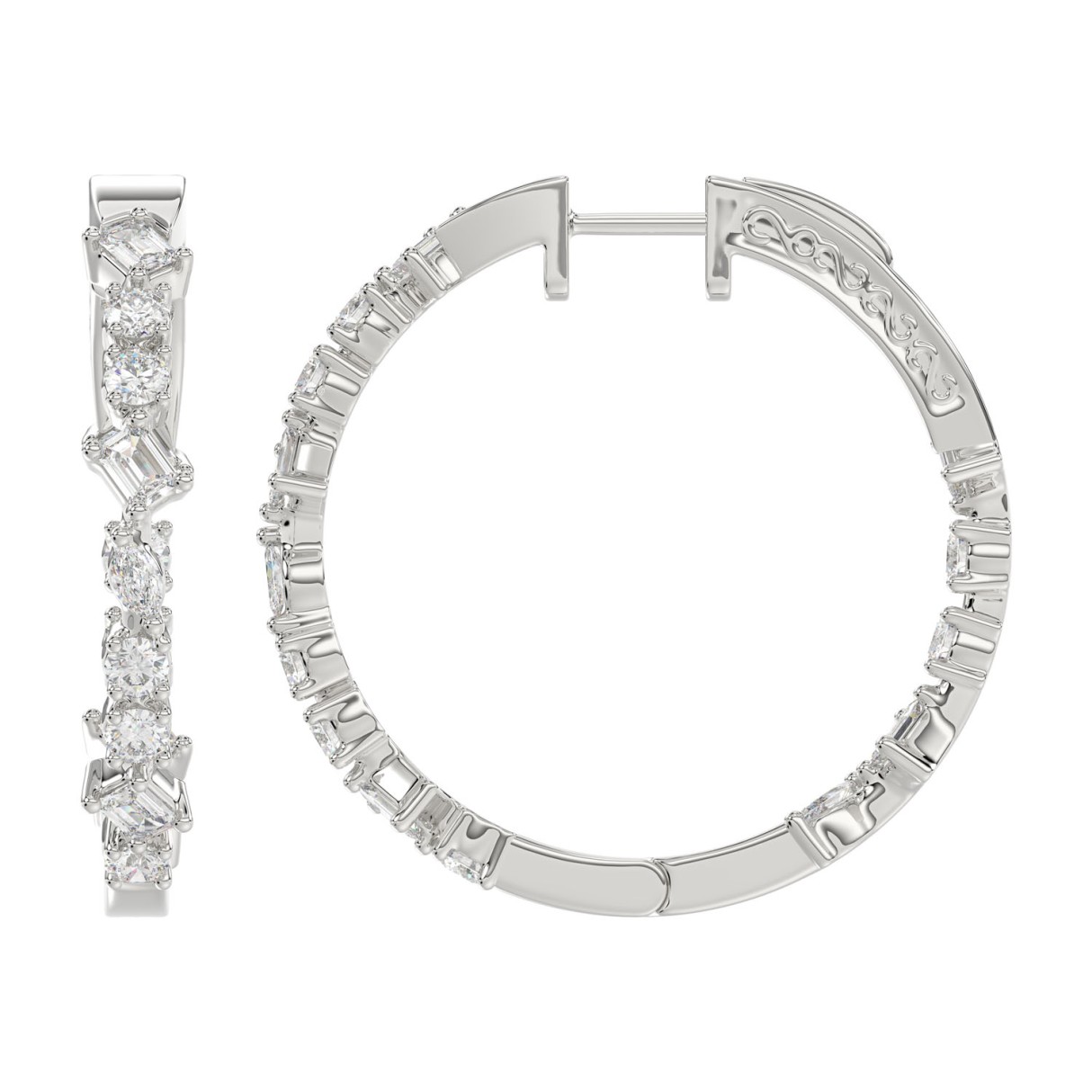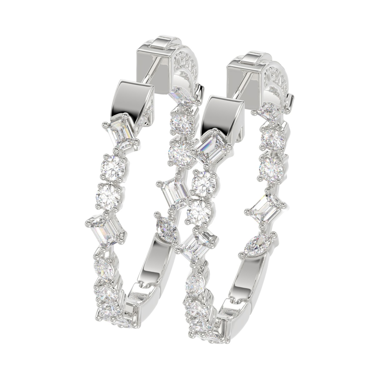 LADIES HOOP EARRINGS 2 1/2CT ROUND/EMERALD/MARQUISE DIAMOND 14K WHITE GOLD